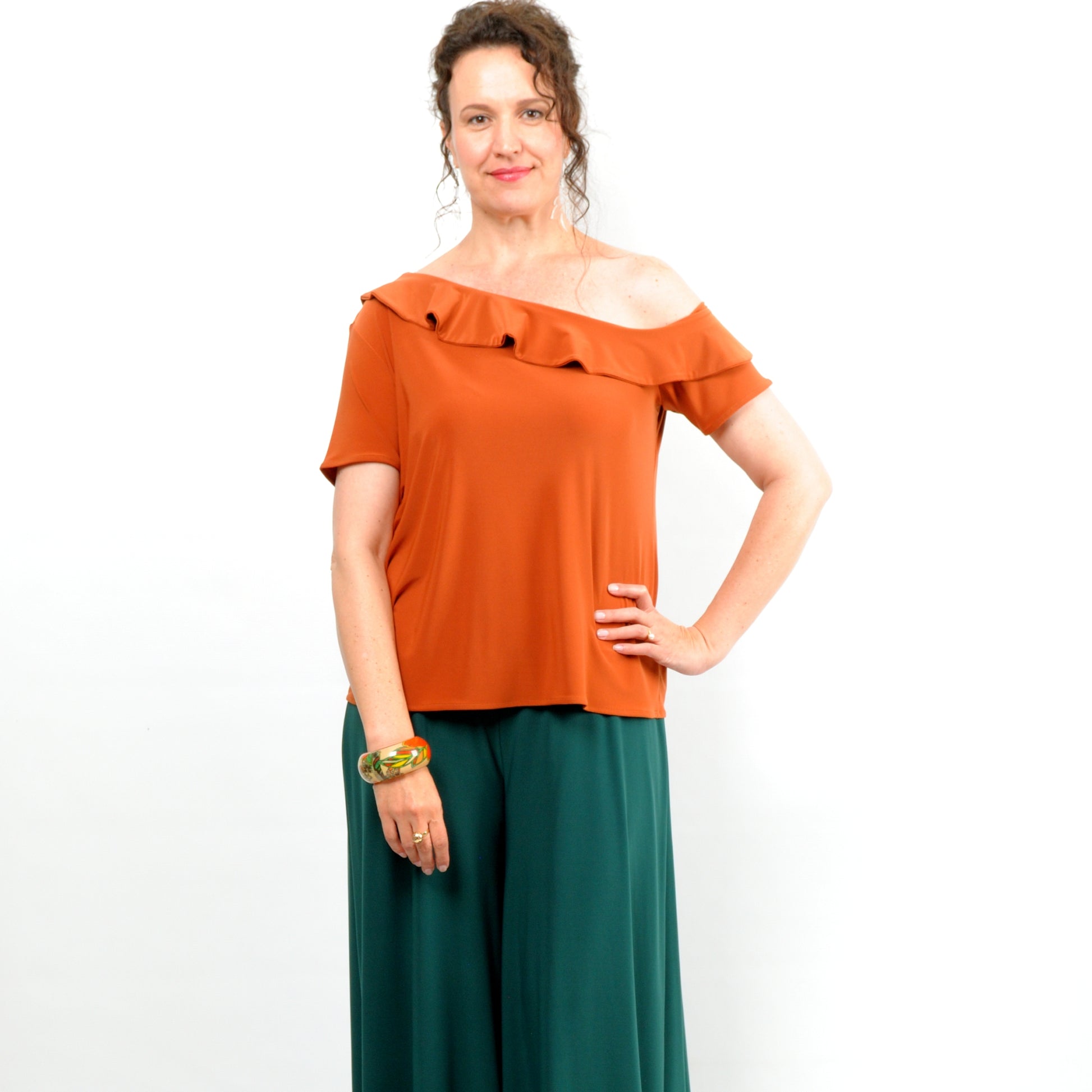 The Melissa Top, with its asymmetrical off-shoulder neckline and charming frill detail, is the perfect choice for those looking to flaunt a bit of skin. This versatile top complements all body types and can be effortlessly paired with our Rosa wide-leg pants for a unique and striking ensemble.