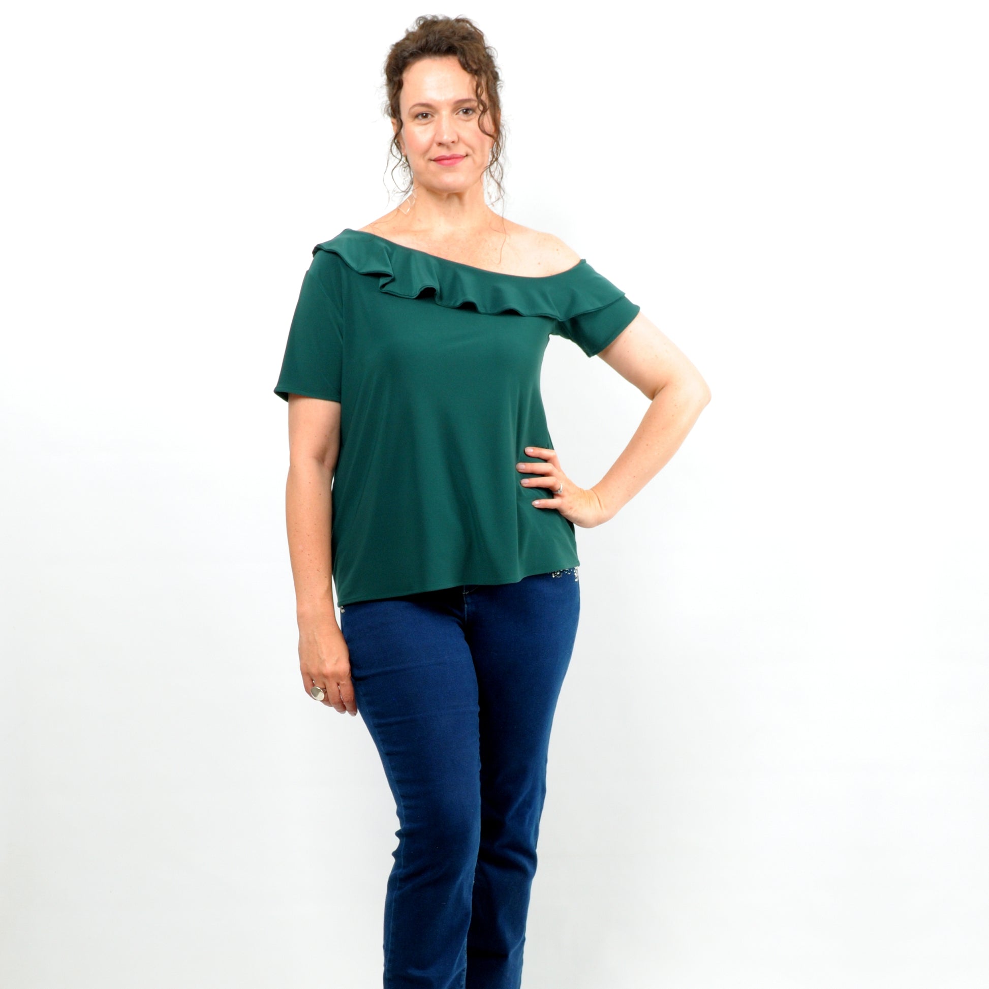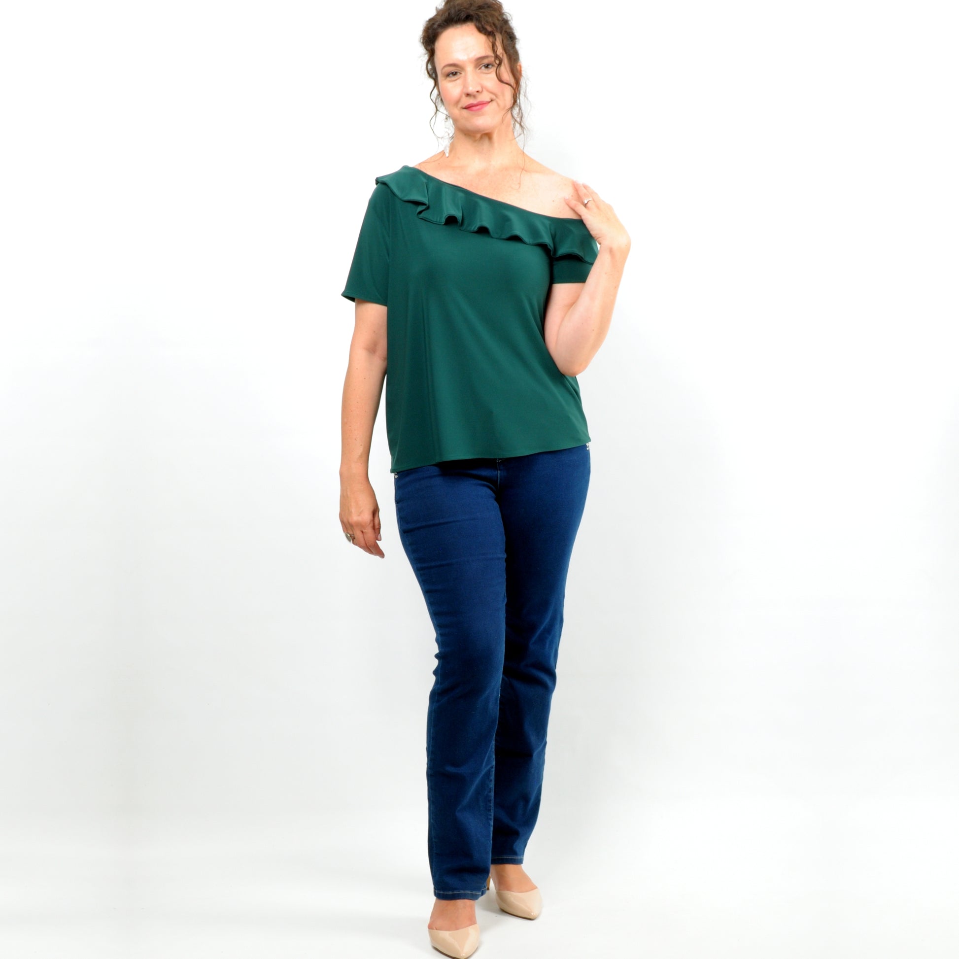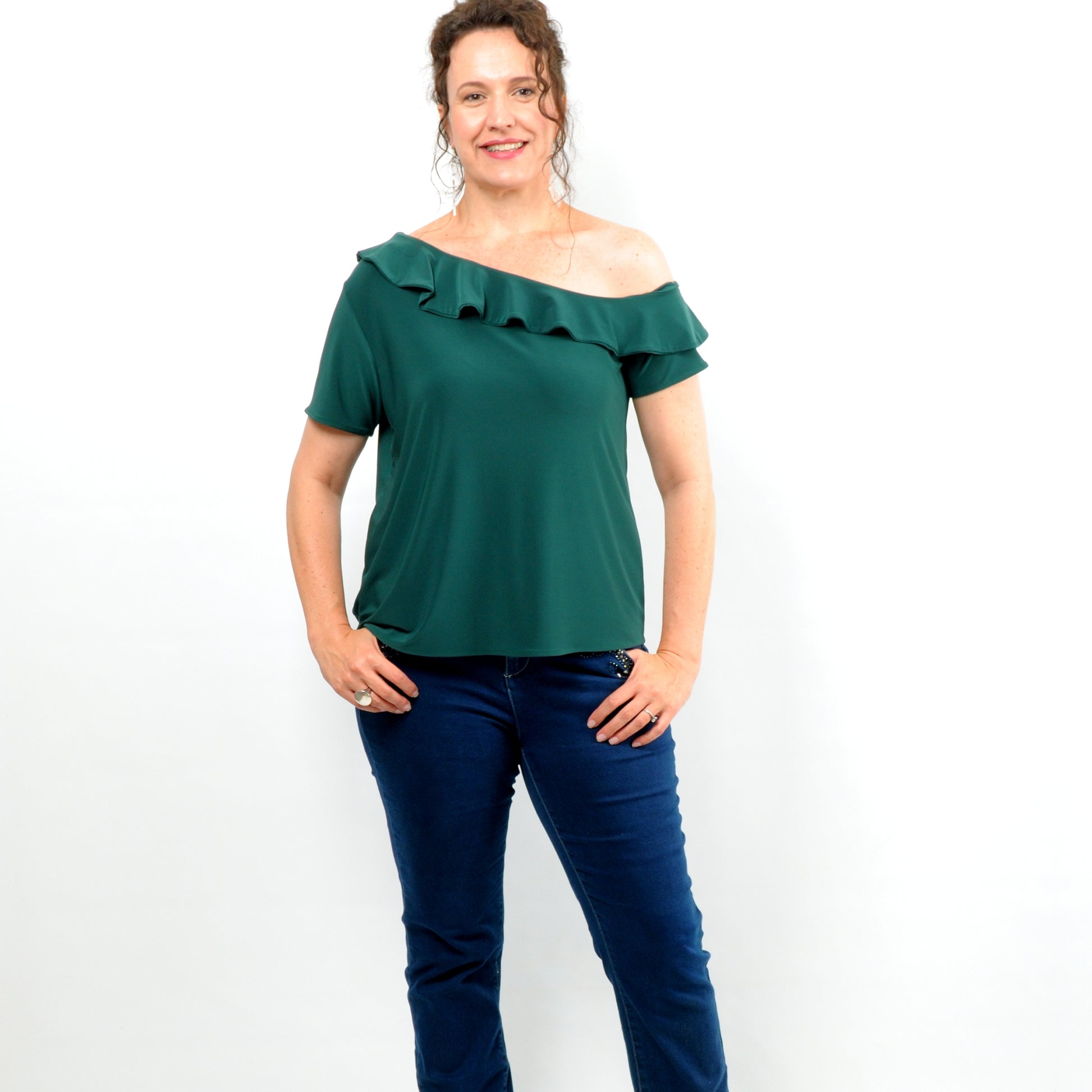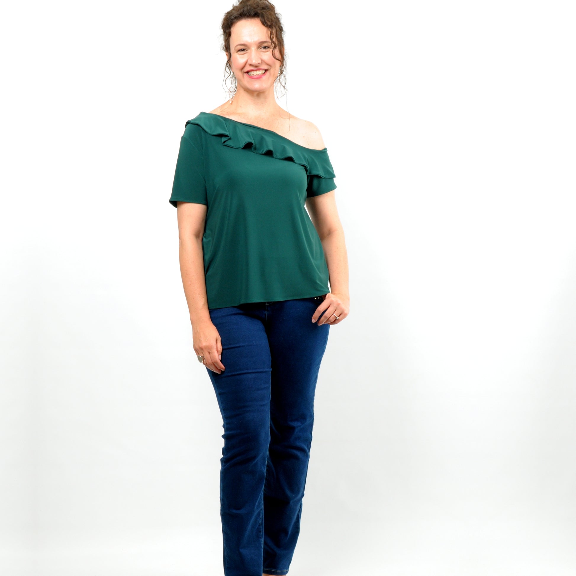 The Melissa Top, with its asymmetrical off-shoulder neckline and charming frill detail, is the perfect choice for those looking to flaunt a bit of skin. This versatile top complements all body types and can be effortlessly paired with our Rosa wide-leg pants for a unique and striking ensemble.