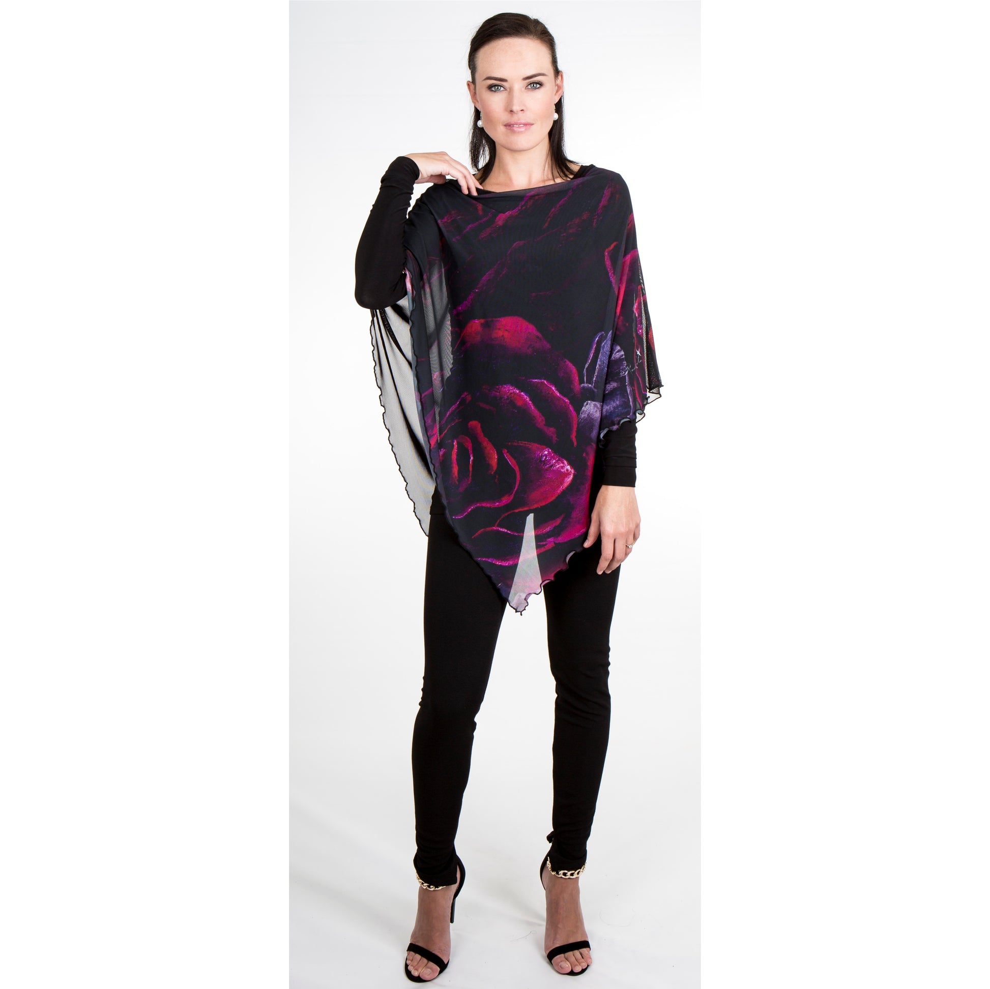 Our Signature pieces feature in-house designed prints, print on demand, and manufactured to order. The Signature ponchos are available with a front print and plain back or with printed back and front panels.