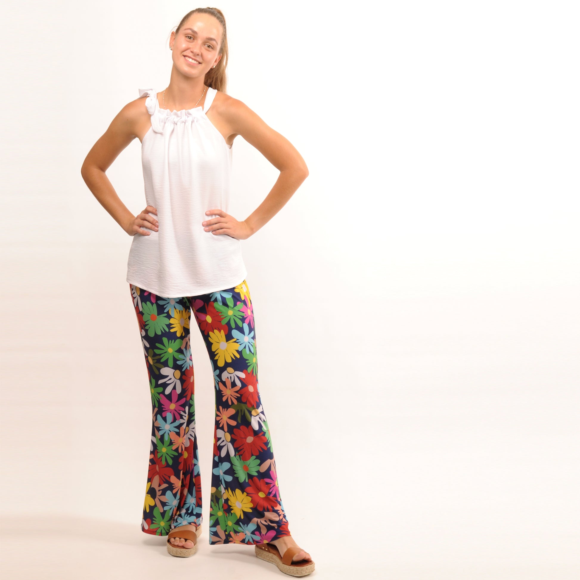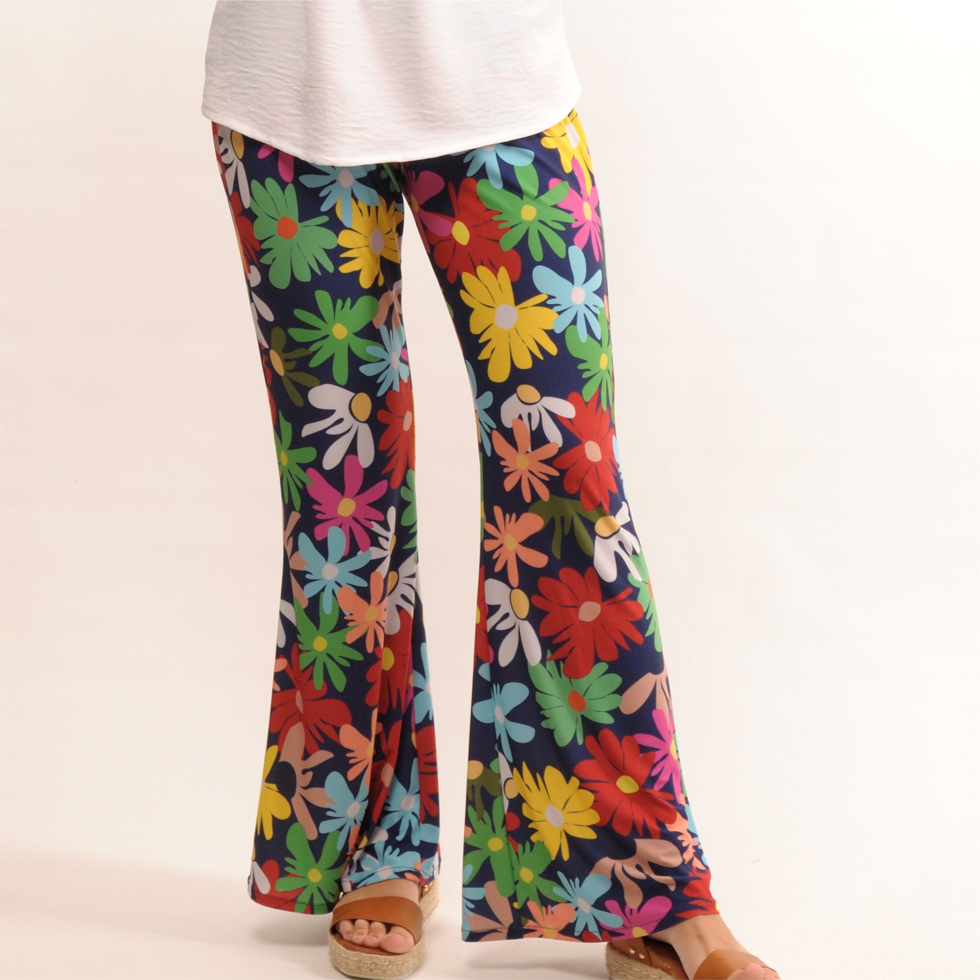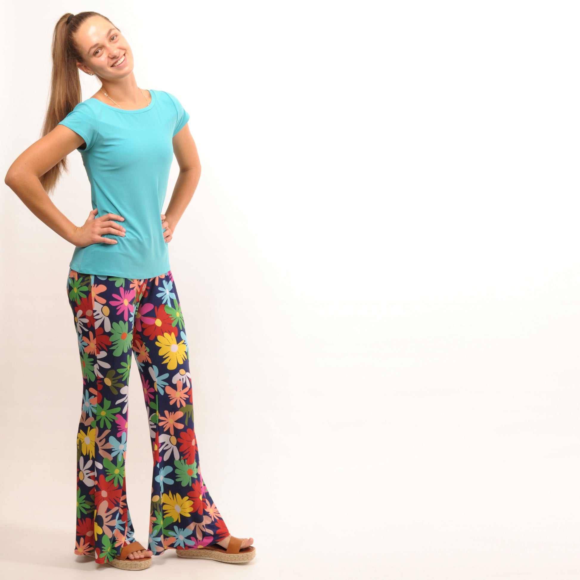 The Happy pants, a part of our Signature Collection, reflects this dedication. Our Signatures feature in-house designed prints, not held in stock but exclusively printed on demand and crafted to order. These pants offer a fitted upper leg that gradually flares out to the hem, providing a graceful silhouette. They effortlessly pair with our Belinda, Carla, Mia, Celia, and Bianca tops, making it simple to create various stylish ensembles.