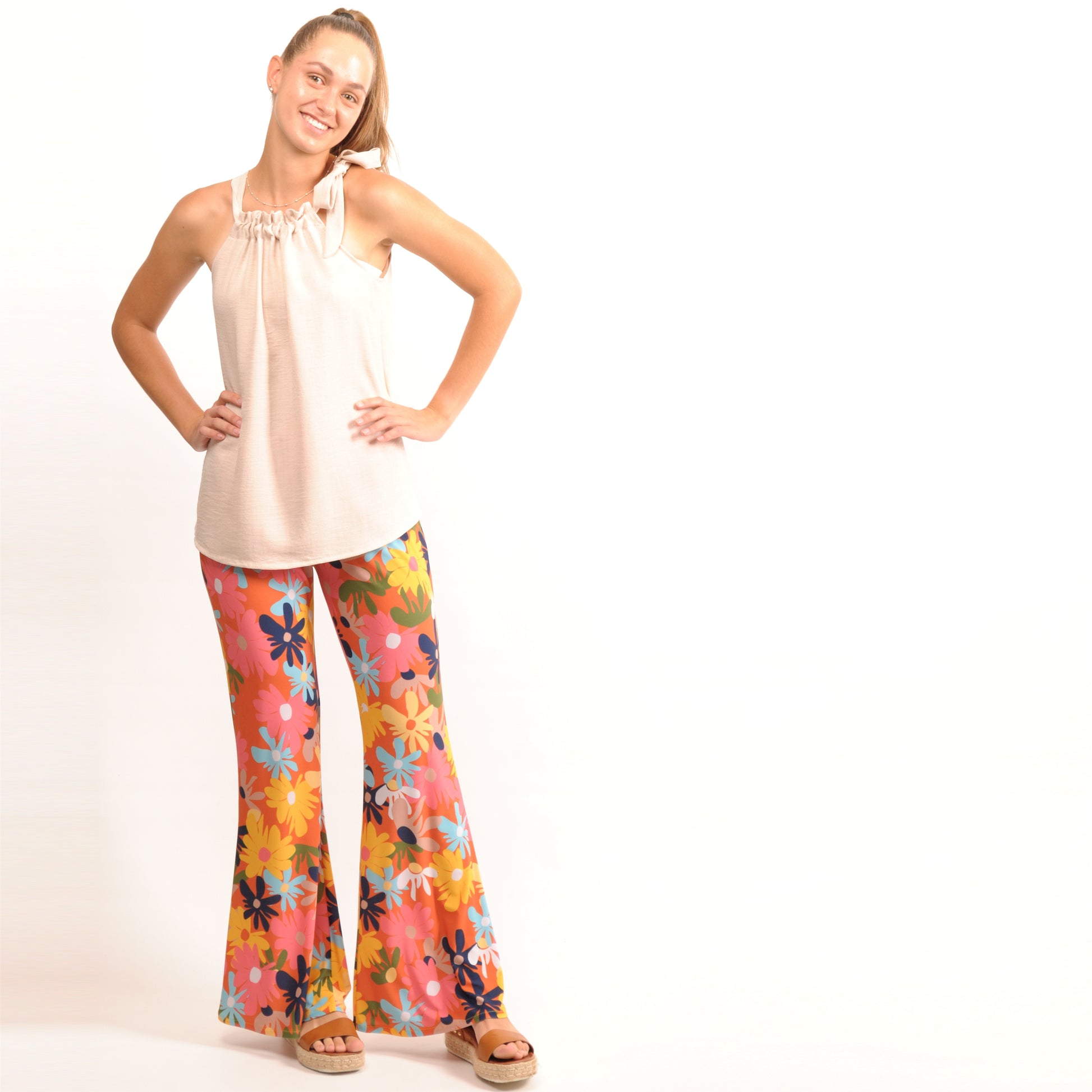 The Happy pants, a part of our Signature Collection, reflects this dedication. Our Signatures feature in-house designed prints, not held in stock but exclusively printed on demand and crafted to order. These pants offer a fitted upper leg that gradually flares out to the hem, providing a graceful silhouette. They effortlessly pair with our Belinda, Carla, Mia, Celia, and Bianca tops, making it simple to create various stylish ensembles.